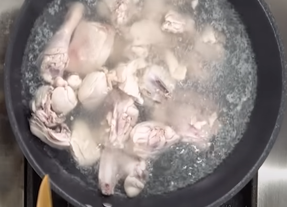 2. 냄비에 물이 끓으면 닭을 넣고 5분 정도 살짝 데쳐줍니다. 끓는 물에 닭을 데치는 과정에서 닭에 있는 피나 불순물 등을 제거할 수 있습니다. 이렇게 하면 닭도리탕을 했을 때 맛이 깔끔하고 닭 특유의 비릿냄새가 나지 않아서 맛있는 닭도리탕을 만들 수 있습니다.