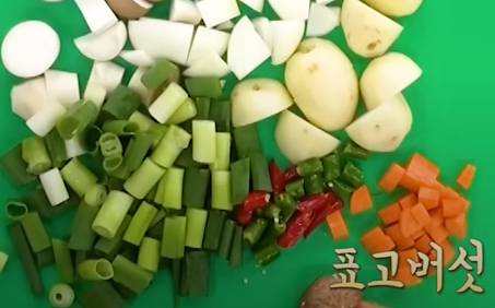 4. 대파 2대는 4cm 길이로 큼직하게 잘라주고, 양파 1개는 깍둑썰기 해 줍니다. 그리고 표고버섯 2개는 6등분 정도 되도록 잘라 줍니다. 홍고추와 청양고추는 어슷 썰기로 준비합니다. 쫑쫑 썰어서 준비해도 됩니다.